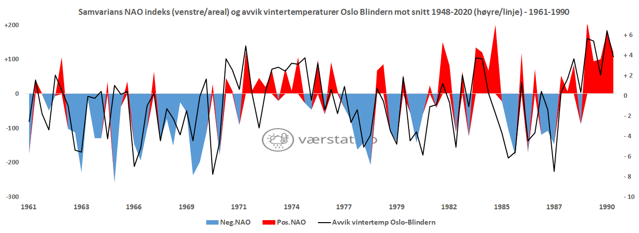 Viktig – i denne gjennomgangen ble perioden 1948 til 2020 benyttet for å beregne gjennomsnittlig vintertemperatur for Oslo Blindern, som avvik er beregnet mot. Dette avviker fra klimanormalene 1961-1990 og 1991-2020. Men, Værstat har vurdert at dette kan gi et godt bilde siden det inkluderer både en periode med tensens med negativ NAO og en med tendens med positiv NAO, og vil derfor kunne representere et gjennomsnitt som er sammenlignbar med fasene i NAO.